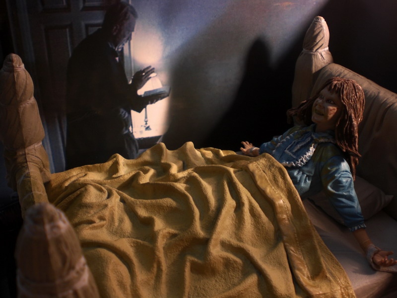 The possessed Regan figure is posed permanently sitting up in the bed bound to the bed by her wrists. The detailed head sculpt on Regan is very well done and captures her look from the film quite well.