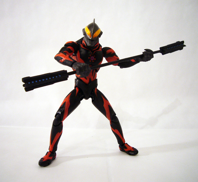 Bandai’s figures are known for their articulation and accessories, and Ultraman Belial doesn’t disappoint in either category. The evil monster has joints at the toes, ball-jointed ankles, double-jointed knees, ball-jointed hips, ball-jointed waist, ball-jointed torso, double ball-jointed shoulders, biceps, double-jointed elbows, ball-jointed wrists, ball-jointed lower neck, hinged upper neck, and an opening mouth that reveals shark-like teeth! With all of that Belial can get into all sorts of cool poses on his own, but it’s really his array of weapons that puts him over the top.