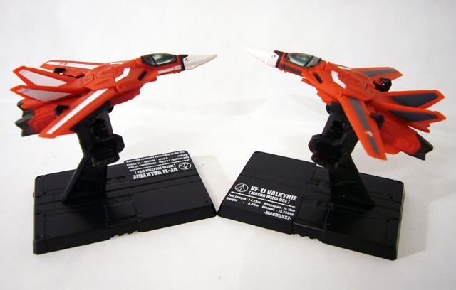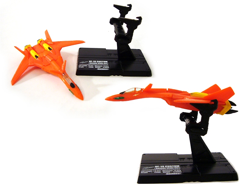 Some of the plastic used on these fighters is a little soft so you might see slight bending here and there, but you’re far less likely to encounter breakage. Some fighters will arrive only partly assembled, but putting the rest of the pieces together is very easy; it’s always obvious where everything goes and the parts fit snugly. And when you put together the stands you’ll find that even though each display stand is identical with regards to parts, the “arms” are moveable on the horizontal bar to better accommodate each fighter or your preferred manner of display. The fighters based on the VF-1 and VF-0 (except the VF-0D) models also have “swinging” wings for even more flexibility in showing off your fighters.