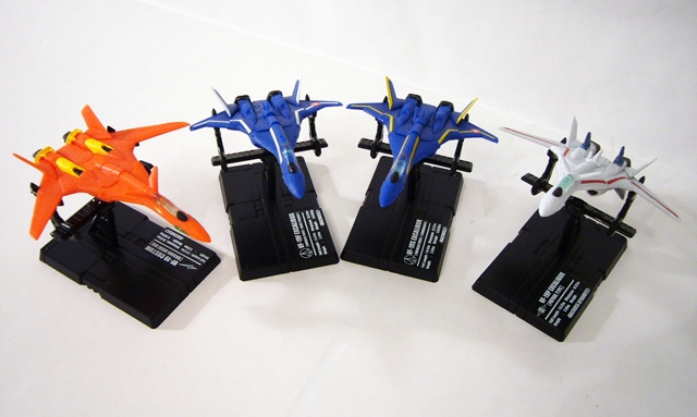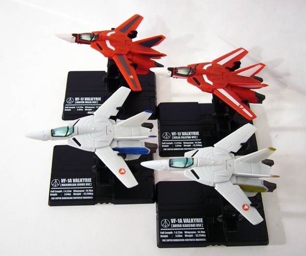 As I noted earlier, the selection of mecha in this set is amazing. Spanning no fewer than six sources, the sixteen (+1) fighters stretch from the very origin of the Macross story as told in the prequel Macross Zero to the far future of Macross Frontier. The bulk of the set comes from the original Super Dimension Fortress Macross and later sequel Macross 7 with five fighters each. However, one of the latter series is a repaint of the VF-1, which is the base model for all five Macross fighters. The rest of the Macross 7 fighters are various forms of the VF-19. Macross Frontier provides two versions of the VF-25, and Macross Zero three variations on the VF-0.
