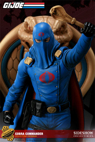 An exclusive version of the Cobra Commander Diorama, which includes two additional switch-out heads; one helmeted and one hooded, switch-out left hand holding a sword, and switch-out right hand holding a pistol for Cobra Commander, will be priced at $299.99 with an Edition Size of 200 pieces worldwide. Additionally, a Regular Edition, without the additional switch-out accessories, will be available for Pre-Order and priced at $299.99.