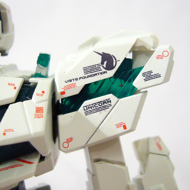 What’s unique about it are the intricate “open” armored plates all over the Unicorn that really do look as though the outer shell is separating! Some of the armor panels are even articulated, especially those around the waist so as not to hinder leg movement. Inside the seams and gaps are translucent green plastic parts that look great against the overall white armor. And while the outer armor is flat white, there are plenty of gray details at the joints in addition to the amazingly intricate text and graphics all over the place.