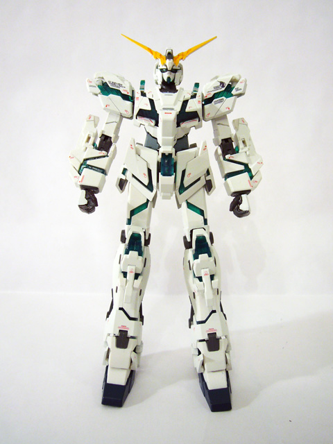 A Gundam this cool needs good articulation and the Unicorn doesn’t disappoint. It has all of the usual joints plus interesting pecs that help the range of arm poseability, movable “skirt” parts, hinged ankle armor, and more. It’s not the most super-articulated robot ever, but it couldn’t be; instead the Unicorn needs great stability in order to carry its massive armory. Even so, the articulation scheme is more than adequate and you’ll get great poses out of the Gundam. In addition to the regular joints it has swing out beam saber hilts in the forearms and easily removable hands for swapping out the included extra parts (fists, gun firing hands, beam saber holding hands, etc.).