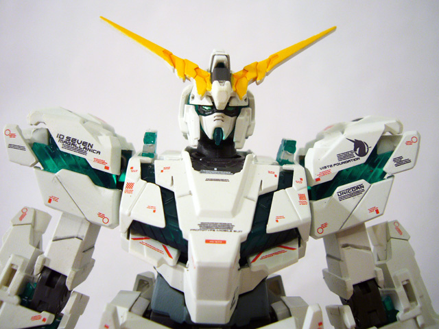 The shoulders have lots of printed info including the tag “ID SEVEN MAGALLANICA” and the Unicorn logo. The Gundam’s head is a very cool helmet and facemask configuration with all of the aforementioned colors and metallic green eyes and yellow crest.