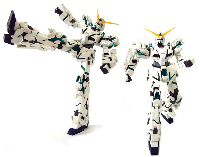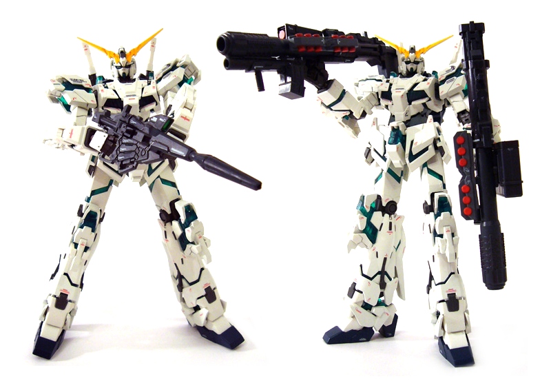 Headlining the Mobile Suit Gundam Unicorn OVA, the RX-0 Unicorn Gundam robot is a deadly unit piloted by Banagher Links. Its basic form features a single “horn” which earns it its name, as well as unique “psycoframe” receptors that boost its response time and agility. Thanks to an ingenious friend of the pilot, the Unicorn is upgraded to its Full Armor Mode. In this configuration the armor is expanded to reveal shining green components, the face becomes more human, and the horn splits into a “V” shape. Beyond the cosmetic differences though, the Unicorn Gundam receives a massive array of weapons and equipment including guns, shields, and booster rockets!