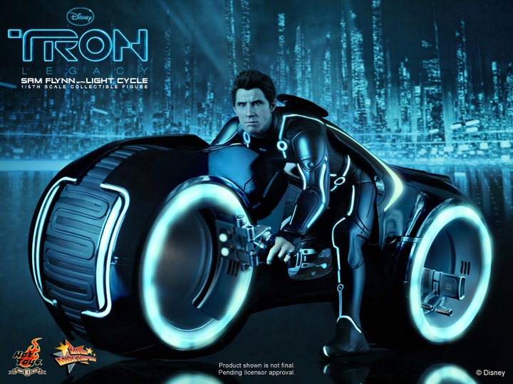 Hot Toys reveals their first 1/6th scale action figure from the upcoming Disney movie TRON: Legacy: Sam Flynn with Light Cycle.