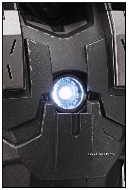 Both arms/hands as well as the chest ARC reactor and eyes light up to provide fans with a bold, bright shine. The eyes are dim due to the red light and angled projection range of the light, however the chest light is by far the brightest of any Iron Man MMS figure so far.