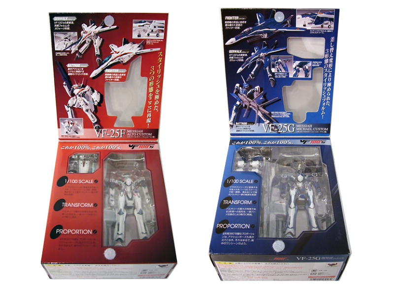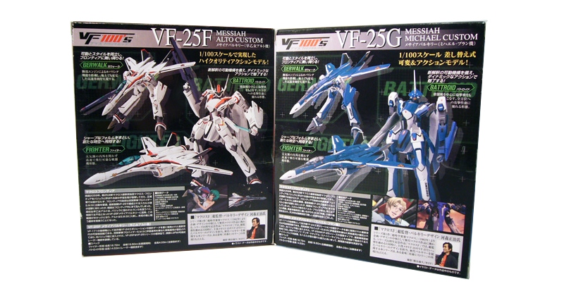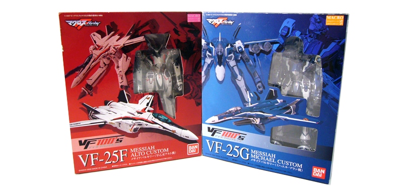 The latest and greatest line of transforming toys from Bandai focus on the latest Macross Frontier series, bringing to life its state of the art VF-25 Valkyries in the 1/100 scale, fittingly called the “VF100s.” From that series we’ll be taking a look at two of the coolest Valkyries, the VF-25F Messiah Alto Custom and the VF-25G Messiah Michael Custom!