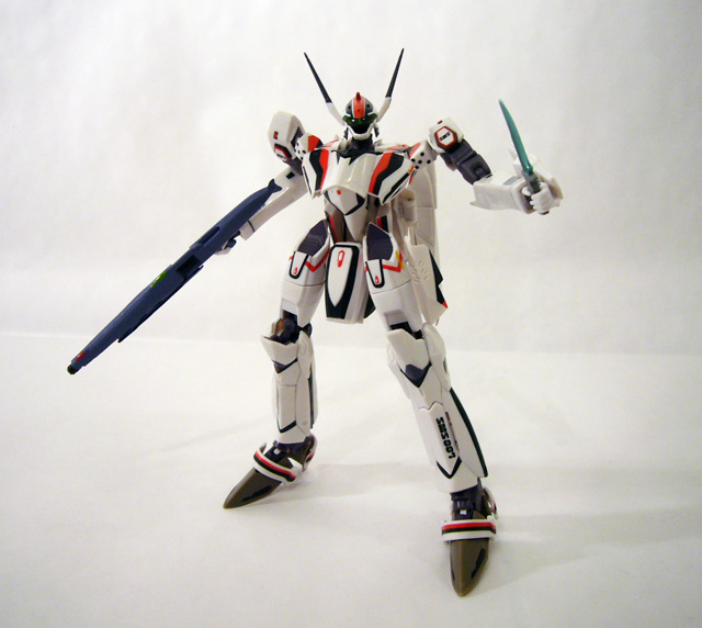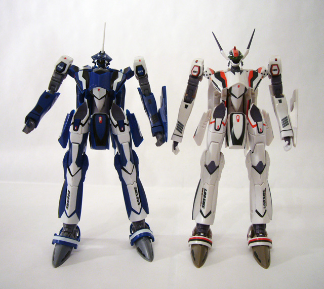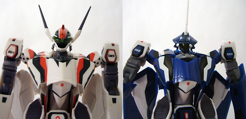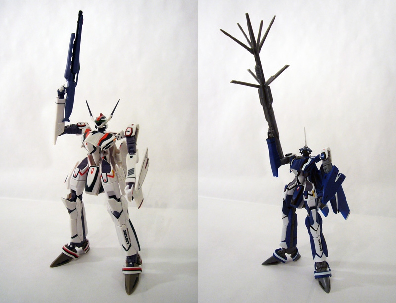 The VF-25s come out of the box in Battroid mode, and this one has the most options. At about 6 inches tall, they’re thin and flexible with great articulation. Colors are bright and crisp on Alto’s primarily white, and suitably darker but no less perfectly applied on Michael’s unit. The two share the same sculpt except for the head units; Alto’s F model has a visored look with two head lasers while Michael’s G has a cyclopean eye and one laser.