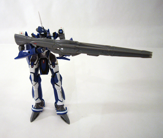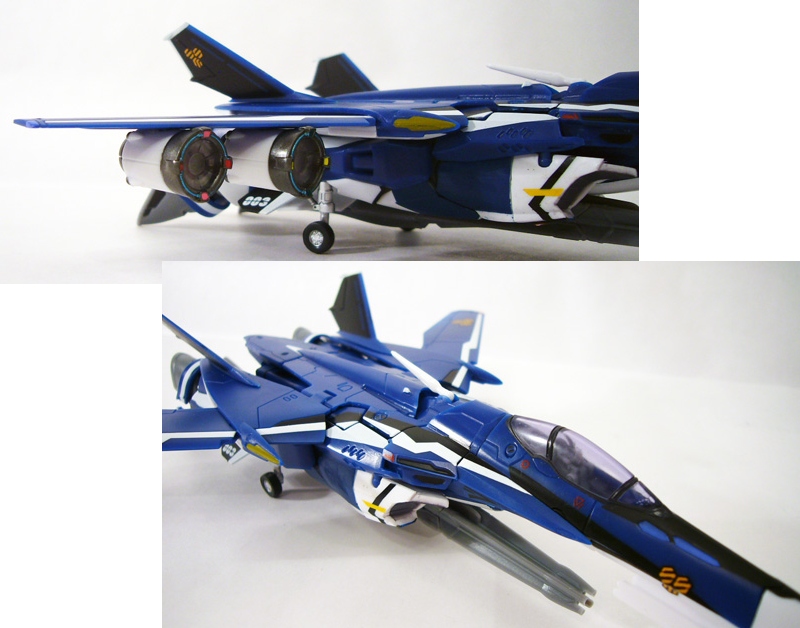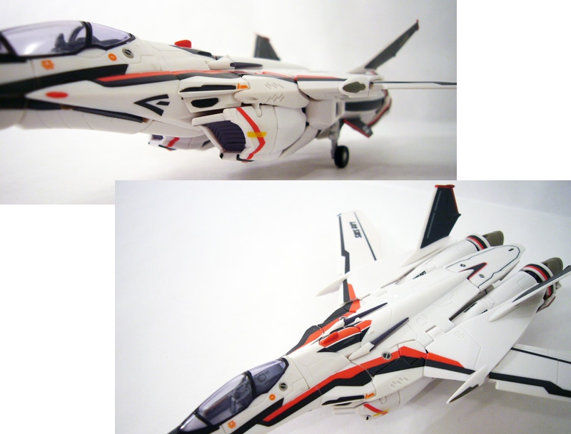 A descendant of the F-14 Tomcat-inspired VF-1 Valkyrie, the VF-25 Fighter mode has a similar basic layout with twin-engines and variable-geometry wings. But the sleek Messiah makes the original Valkyrie look dated and clunky in comparison! The long lines of the fuselage are sleek and streamlined, with twin air intakes, spines, and tail fins. You can still find elements of the Battroid in the Fighter like the top-mounted head lasers and the feet for thrusters.