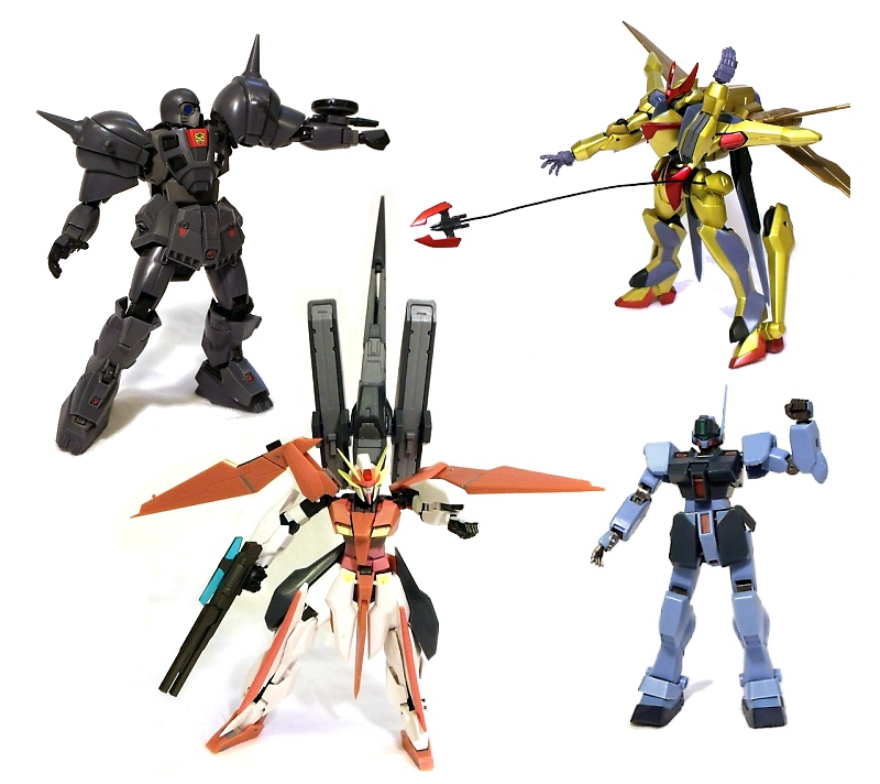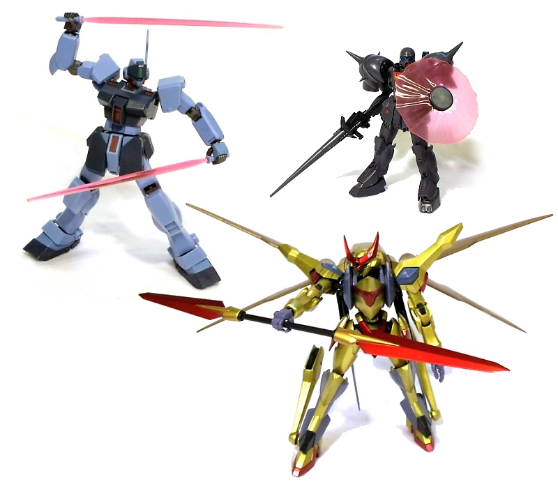The more advanced (and pricier) models, like the KMF Vincent, pack an incredible wealth of extras. This figure includes a double-bladed staff that can be broken down, removable panel armor, attachable grappling hooks and an "X-Wing" like jet pack that allows you to convert him to full flight mode. In the case of the Arios Gundam Ascalon, two GN rifles and beam saber are included, HUGE bladed jet pack, and get this: the entire figure can transform into a spaceship WITHOUT the need for bit-swapping. Even less advanced mechs like the Sniper II and Den'An Zon don't short-change you. The Sniper II packs some heat with a cool sniper rifle, two beam sabers and detachable shield. The beam saber hilts even stow away on its back when not in use. The Den'An Zon includes an extendable lance-like rifle and translucent laser shield.