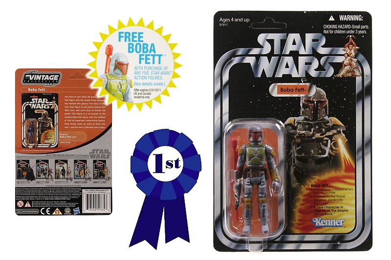 In the spirit of the '80s, Hasbro reintroduced fans to the vintage package designs for their new Star Wars Saga figures (including the prequels) and with that came the return of the "Free Figure with Proofs of Purchase". Paying homage to what has come before and giving older fans something they've always wanted, Hasbro gave fans reason to rejoice with a retooled retro vintage Boba Fett with actual firing Rocket Launcher. Finally! Fans need only buy FIVE Star Wars figures and send in a check for shipping and handling.