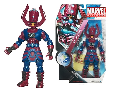 In 2010, Hasbro's Marvel Universe toy line grew to "Galactic" proportions with its addition of the colossal eater of worlds: Galactus. For those who attended the San Diego Comic-Con this year, Hasbro released a limited edition blister-carded version of the electronic Galactus figure several month before the regular version was released at mass retail. The Comic-Con exclusive version measures almost 2 feet in height and features exclusive artwork by Joe Quesada. This gigantically-sized exclusive figure can be conveniently carried around thanks to its suitcase-styled cardboard box. While the same exact figure was later released at mass retail in different packaging and with a bonus Silver Surfer figure pack-in, the gigantic blister carded SDCC version is one of the ultimate Marvel convention exclusives of all time and a timeless treasure to be kept mint in package next to all your regular Marvel Universe carded action figures.
