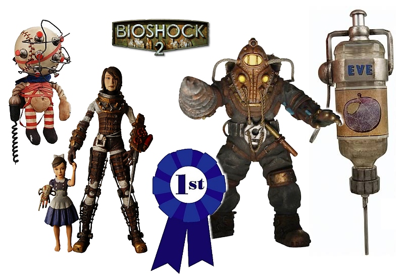 In 2010, NECA made up for lost time by unleashing a flood of amazing merchandise based on the inevitable sequel, BioShock 2. A hulking Big Daddy Bouncer action figure anchored the series with its instantly recognizable (mutated) good looks. Soon new characters joined the fray, including the sequel's protagonist, Subject Delta, as well as a new watery foe, the Big Sister. While only a small fraction of the size of the Big Daddy, the Little Sister action figure charmed collectors with her ghoulishly cool sculpt and surprisingly high points of articulation. Some of NECA's neatest BioShock items weren't action figures at all, but well-designed prop replicas. A Big Daddy rag doll seemingly created of random pieces of junk and an EVE Hypo coursing with blue luminescent powers were just two must-have BioShock props, both packing loads of value at under $20.