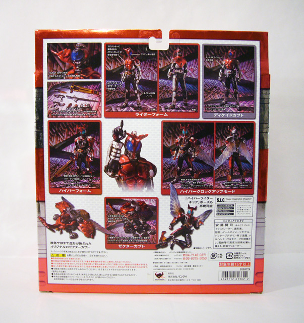 Kamen Rider Kabuto is dynamic even in its box, a great metallic red beast of a thing. The front window shows off just one layer of the package’s contents including the base figure and the large Kabuto Zecter shell. The J-hook panel on top has the S.I.C. logo along with the figure’s full name. Decorated in the hero’s colors (red, silver, and black) and a repeating hexagonal pattern, the box has even more windows on its sides.