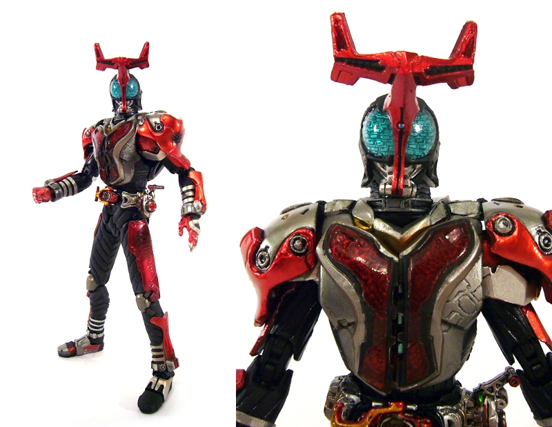 Without delving too far into the Kamen Rider mythology, each hero has various forms and specific equipment for each. It’s just so with Kabuto, whose basic form wields a dagger and a gun that transforms into an axe. Swapping out a couple of parts turns him into his “Decade” version that also has its own weapon: a sword/gun/book. This form’s belt is much smoother with a large silver “buckle” decorated with red spheres. The alternate head (that’s used in most of the other forms as well) is an upgrade with green “eyes” and larger horn, which is easy to replace on the neck ball joint.