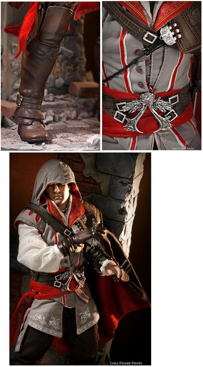 Based on the look of the character from the beginning of his saga, this younger Ezio features all of the minute details seen in the fan-favorite game, including the baby smooth face, parted hair, pony tail, and scar on his lip (above). Overall, this is one of the most accurate and impressive 1/6th scale figures based on a video game figure ever.