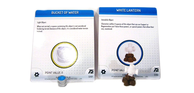 The villainous Grodd offers a mid-priced villain to lead your Gorilla City army while Troia’s increased power level is close to her White Lantern incarnation. Impulse is a character long missing in the HeroClix lineup, and Icemaiden brings another solid member to Global Guardians and Justice League teams. And then there’s Gleek who brings a level of craziness to your games; he helps out as long as the Wonder Twins are on your team, but without them he buffs your opponent! The Bucket of Water can be used to make water terrain (great for figures with powers that require it) and works hand in hand with Zan’s water powers, while the White Lantern assures that nearby figures can heal or be healed (with Support or Regeneration) without those powers being countered.