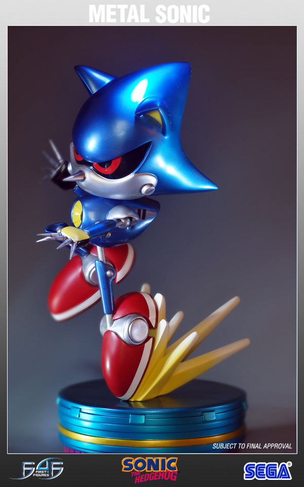 Scheduled for release second quarter 2011, the Metal Sonic statue is being offered as two 14.5 inch tall versions: a regular release (pictured above) that is limited to 1,500 pieces and priced at $154.99 and a first4figures.com exclusive version limited to only 350 pieces and priced at $174.99. The latter features light up eyes, chest and back engine. Additionally, the base comes with lights that light up the transparent spark by alternating between flashing and continuous lights. The lights slowly fade away after you turn them off.