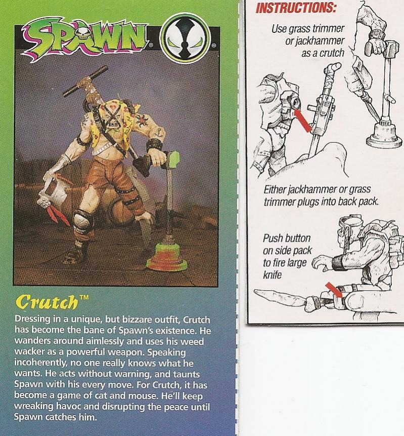 This assortment of Spawn figures was a mixed bag of good and bad. Standouts included the titular Spawn III with enourmous opening wingspan, the rotting Zombie Spawn whose weapons I still cherish today (sword, sawed-off shotgun, machine gun AND a wicked chainsaw!), and the underappreciated No-Body which was a cool nod to TMNT's Krang. Crutch was probably the weakest of the bunch (seriously, a weed wacker?), but being the Spawn-obsessed collector I was in the day... I bought him anyways.