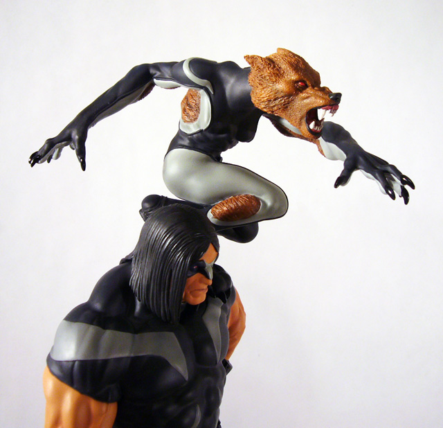 If you get the Sideshow Exclusive version of this statue (and you should!), you also get a second Wolfsbane figure! This one is in full wolf mode, and about as opposite as you can get from the regular version. While that one rests calmly upon Warpath’s shoulder, this one is leaping forward with claws extended and bared teeth snarling. The piece has a really excellent sculpt with textured fur, knobby fingers, and sharp claws. Combined with Wolverine, Wolfsbane really presents you with two display options: the more humane X-Force with unmasked Logan and human Rahne or the vicious mission-ready masked Wolverine and feral Wolfsbane!