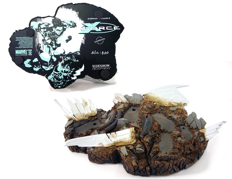 The X-Force diorama represents the team around the end of their first mission as told in the “Angels and Demons” storyline. They’ve killed their target Risman and his Choir troops, but face new enemies in the form of Eli Bard and the reborn Bastion. The team stands together on a harsh and cracked landscape littered with wreckage and fragments of the Choir’s wings. Warpath forms the group’s center, standing at ease with a dagger in one hand and the other sheathed behind him.