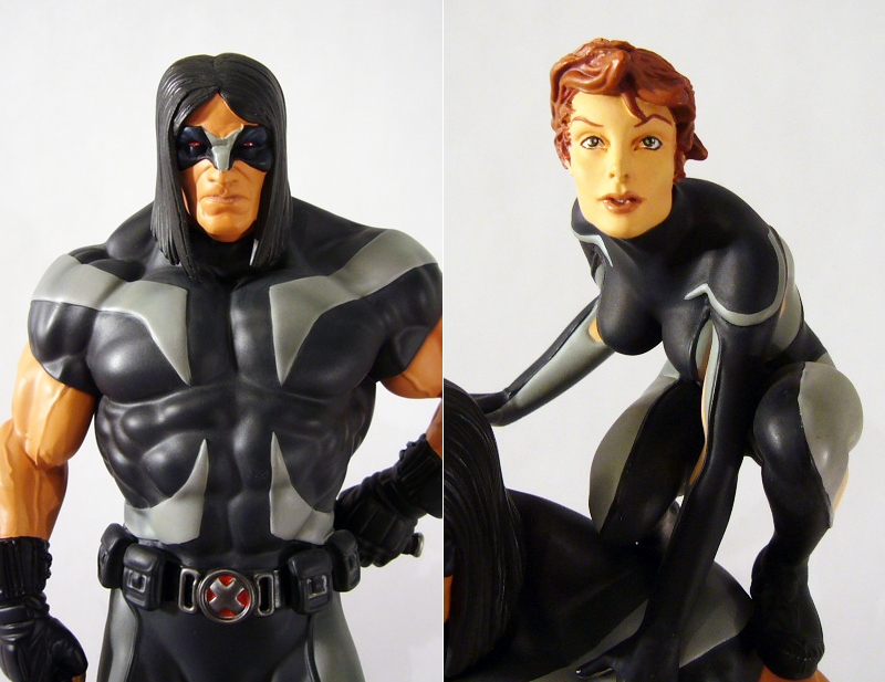 Paint applications are super sharp on the mutant kill team. The comic series was known for its stark colors, with the team’s colors generally varying little between gray, black, and flesh tones with hints of red (and much more when in combat). True to form, the members of X-Force wear their utilitarian and yet still sexy gray and black uniforms, each of which is unique with regards to the style and pattern shape. The flesh tones of the mutants are all different, generally darker on the men and lighter on the women. Bright red shows up on their belt buckle “X” symbols, as well as their masked eyes. The various blades, both adamantium and vibranium, are silver, as are the shredded wings on the base. Look closer for a lot of painted details like the hair on Wolverine’s arms!