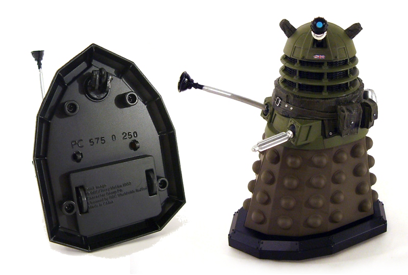 Anyone familiar with Doctor Who over the last 47 years knows what a Dalek looks like. A single eye stalk extends from the domed head, along with two clear cylinders used in communication. The central body is barrel-shaped, and the forward-facing panel features two extremities: a ridged energy death ray and a black “plunger” tipped manipulator arm. Below this is the Dalek’s “skirt,” studded with control spheres, rounded in the back and coming to a point in the front.