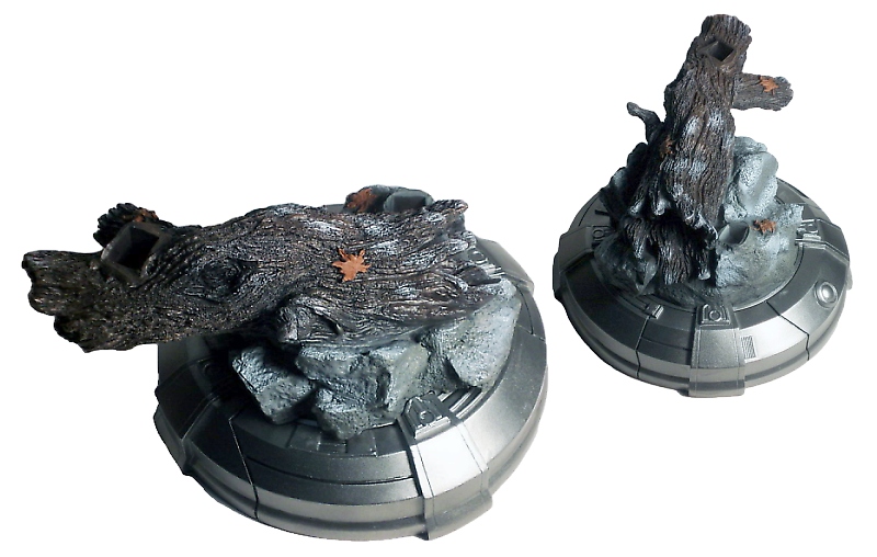 The uniquely designed base resembles a forest environment complete with jagged boulders and plant life which sit atop a circular hologram generator from the X-Men's Danger Room. The base lights up which makes the forest environment seem like a holographic projection when turned on. The boulders and snow-covered tree trunk are molded in a translucent material which allows the blue light within the base to shine through the environment.