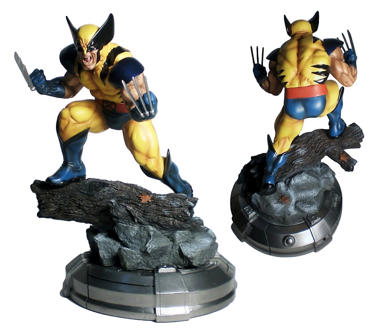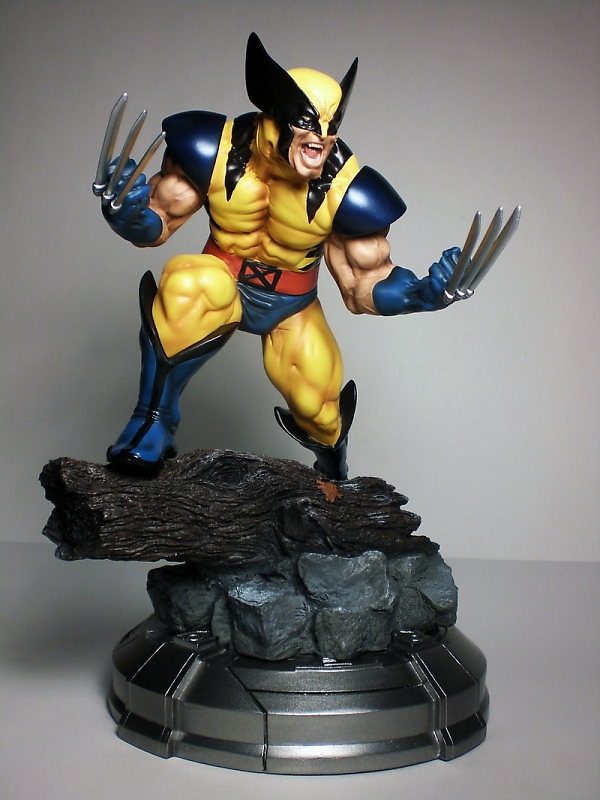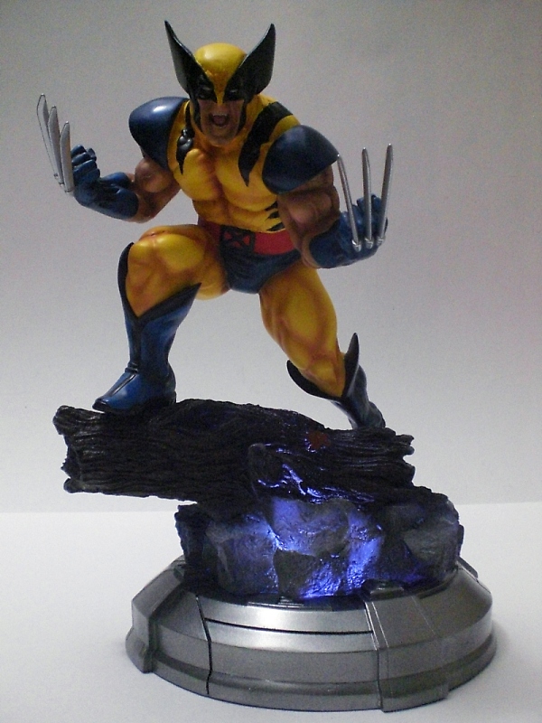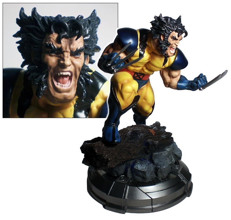 PAINT: This version of Wolverine depicts the characters classic tigerstripe blue and yellow costume which vividly colored with a very high level of precision. The flesh-colored portions of the piece are accented with varying hues of light and dark shading which adds depth to the piece. The realistic shading continues onto the rest of the body. The display base is painted exquisitely with a vast pallet of earth tones and dry-brushed details with auburn-colored leaves and snow scattered about it’s surface. The Danger Room base is colored in a solid metallic silver which adds a sleek and industrial element to the piece.
