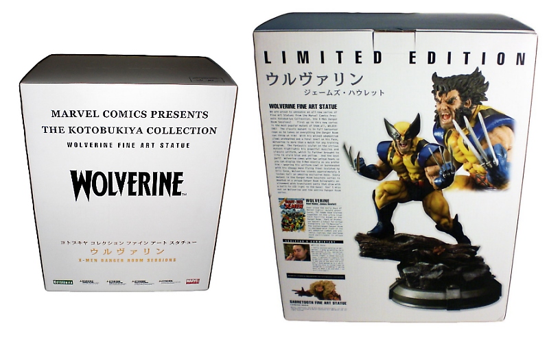 PACKAGING: Kotobukiya continues their tradition of fine collectibles with this simple, yet elegant Marvel Fine Art Statue packaging. The statue is housed within a solid white outer box which features golden lettering along the front side and the character's name embossed on the upper lid and side panels. The back of the box showcases the Wolverine statue with a pair of images of the actual piece along with an informative character and artist bio, in this case, master sculptor Erick Sosa. It's seldom seen that a company includes an artist bio and commentary and it is a great thing to see Kotobukiya giving this sculptor his well-deserved place in the spotlight.