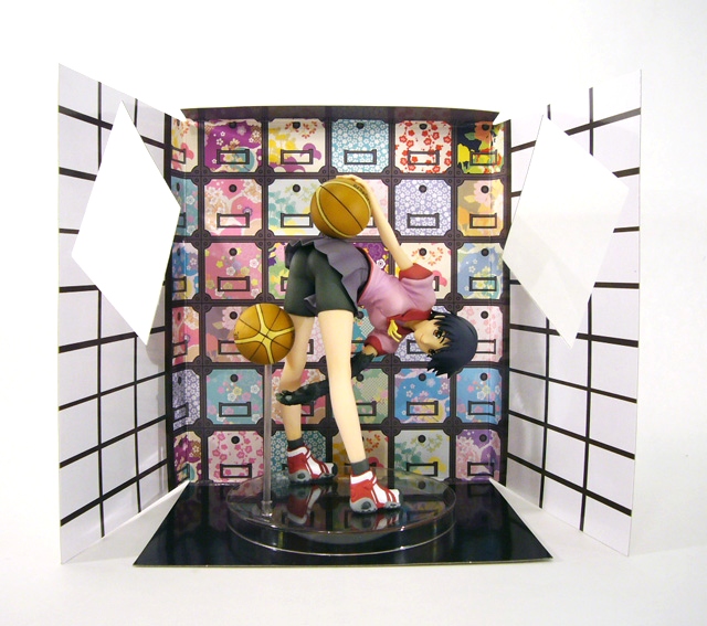 The stand is absolutely necessary to display the figure; she won’t stand up by herself. The basketballs are lifelike though solid plastic, decorated in brown and yellow with “B/Sports” logos. The statue works fully in the round, though there are certain angles that are more attractive than others. While it’s certainly not obscene, her pose is a little suggestive and you might want to rotate her so that she’s not exactly bending over in your face. You can even make a simple diorama out of the package insert, a four-panel interior scene!