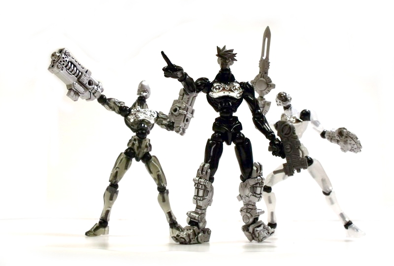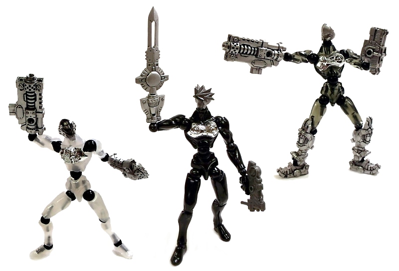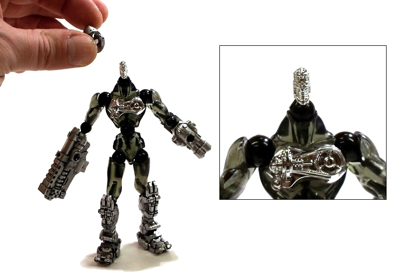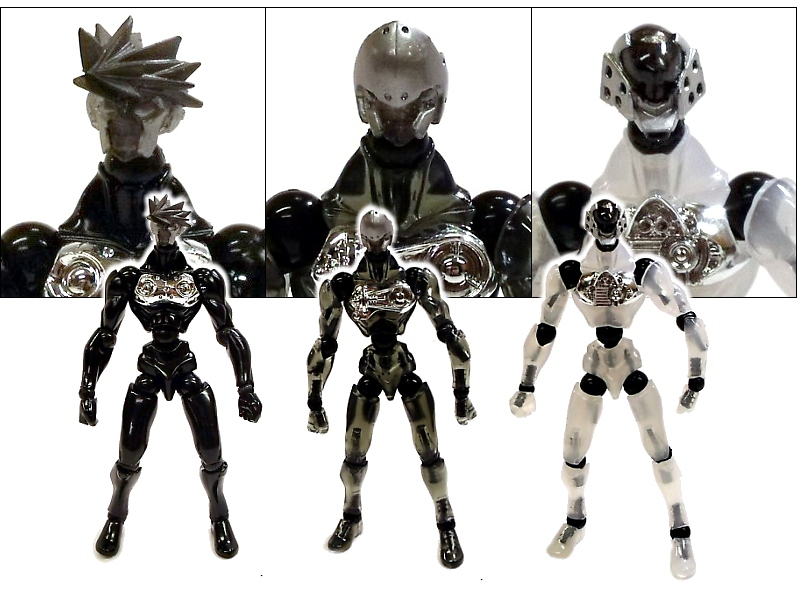 SCULPT: Right out of the pack, Assemble Borg's homage to the Micronauts is clearly evident with the use of colored, often translucent plastics combined with "chromed" parts. All three heroes feature a standard 5-inch tall body, each molded in a unique color. Mr. Assemble is cast in solid black plastic, Baron a smokey translucent, and Cyber a milky white.