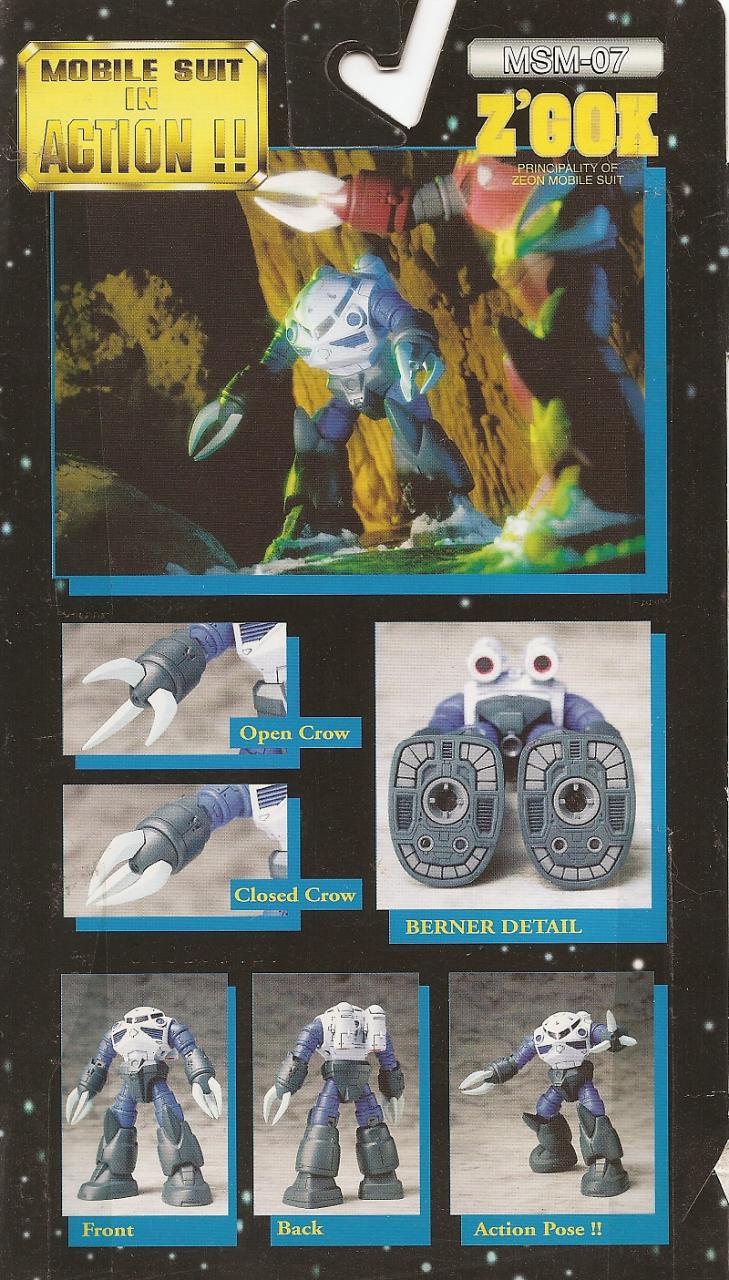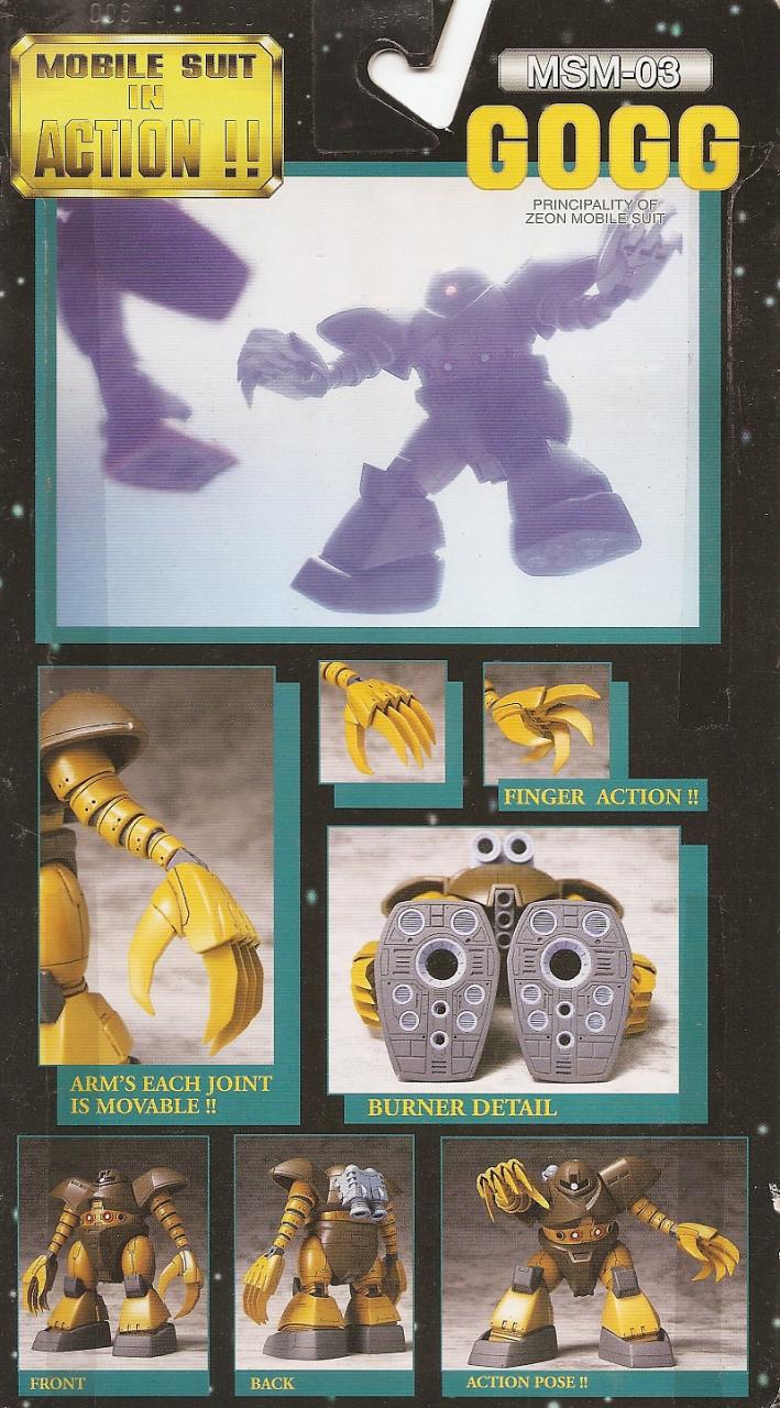 When I first visited Japan many moons ago I thought I had died and gone to Heaven. Toy stores are everywhere - even in the airport - the place where I found these sweet Gundam Mobil Suit in Action figures. There they were just hanging on the pegs, as common as a GI Joe or Star Wars figure here in the States. They were just as affordable too, prompting me to snag all five of the characters they had in stock. Being my first real Japanese toys (I owned imports, but common, I got these IN Japan), all five hold a special place in my heart, but if forced to pick a favorite I'd have to go with Gogg. The stumpy mech appeals to me in so many ways, from it's cool color scheme, unusual aquatic nature, to its individually articulated bladed fingers.