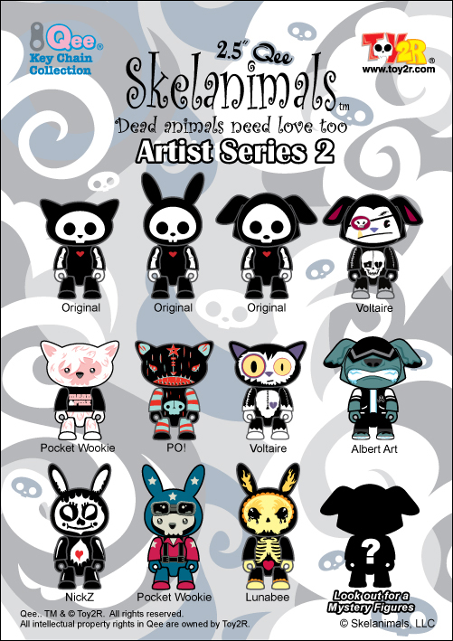 Series Two includes designs by designer art toy favs - Voltaire, Lunabee, PO! (Patricio Oliver), Albert Art, Nick Z and Pocket Wookie. Also included will be classic B&W interpretations of Dax, Jack and Kit along with a couple of mystery chase figures. As always, each blind boxed Qee figure will include keychain attachment to carry your Skelanimal wherever you wish.