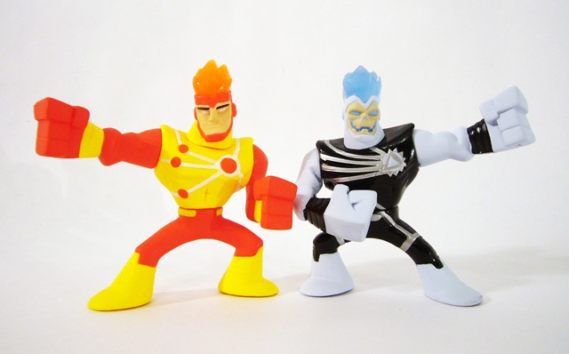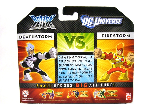 The Action League figures all stand just over 2 inches tall, up to about 2 ¼ inches. The character selection is really interesting, with one hero and one villain each. Superman vs. Bizarro is a no-brainer, and would work in any line. But the others are really tied to recent comic book events. Hal Jordan’s number one nemesis is Sinestro, but here we get the rogue in his White Lantern uniform as he appeared in Blackest Night. Similarly, while Captain Boomerang was one of Flash’s Rogues, he was dead for a while and only recently came back to life at the end of Blackest Night (and subsequently appearing in Brightest Day and the current Flash storyline). Then there’s the most interesting pairing. Firestorm doesn’t usually have an arch nemesis, but he himself turned into a pretty cool bad guy as the Black Lantern Firestorm. In Brightest Day, part of that entity has returned, now morphed into the incredibly wicked Deathstorm. Most shocking to me is that Mattel actually named the figure that; as a kid’s toy the “Death” name is pretty crazy, especially when they might have called it Black Lantern Firestorm instead.