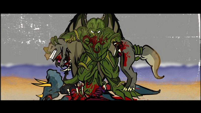 The Last Lovecraft is definitely part horror/part comedy, and so it has its fair share of blood and guts. The creature design stands out especially in the case of the Deep Ones and the sucker guy on the car window. One thing that really sets this film apart is its animation. Director Henry Saine put his hand to several pieces including the opening credits, a map travelogue, and a really incredible “history” of Cthulhu in the film. Designed on two levels to bring Jeff (and the audience) up to speed on key elements of Lovecraft’s Mythos, this sequence features a comic book style, great character design, and lots of easy to digest information. Who doesn’t love a mad Cthulhu slaughtering a herd of shoggoths with the head of a triceratops?