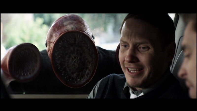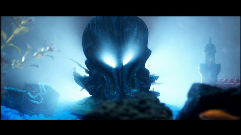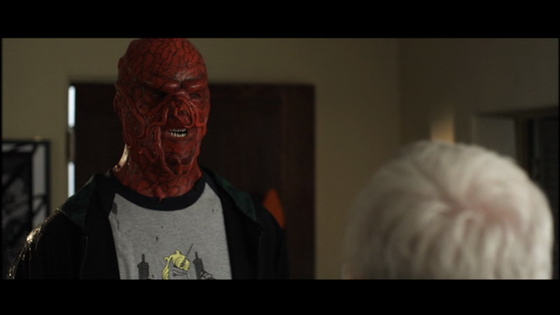 Pop in the disc and you’ll see the usual assortment of pre-movie trailers. The main DVD menu repeats the artwork from the case, with animated explosions in the background. The film is divided into 14 sections in the “Chapters” menu, and Setup lets you choose between regular audio and commentary (hilarious – just in the first moments the creators discuss some challenging FX and share some really interesting anecdotes) as well as English or Spanish subtitles. The Bonus menu has four items. The Extended Scene builds on the Miskatonic University intro, adding more Lovecraftian ideas about intelligent life on Earth other than humans, and it includes a brief Star Spawn attack scene not otherwise in the movie. The Pencil Test takes you behind the scenes of the animated comic book sequence with notes by the director. Behind the Scenes Stills have shots of makeup and prosthetics, the relic, catering, Richard Riehle, concept art, location filming, and more. Finally, there’s a trailer for the film.