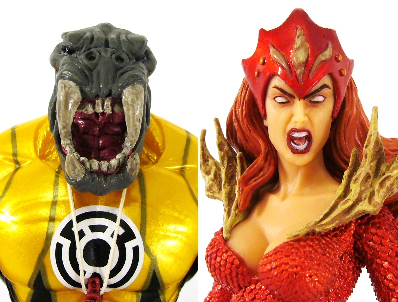 As usual, with sculpts and paint applications so good the articulation on DC Direct figures must take a back seat. Both figures are pretty traditional in that respect. Mera has the least with joints at the neck (very restricted due to the collar and hair), ball-jointed shoulders, elbows, V-crotch, and knees. Arkillo fares better with a more functional neck, ball-jointed shoulders, elbows, wrists, T-crotch, knees, and ankles. The Sinestro Corps warrior has a pretty good range of motion for a big brick, while Mera is definitely a pose once and display sort of figure. Thankfully, she looks good in the poses she’s built to do!