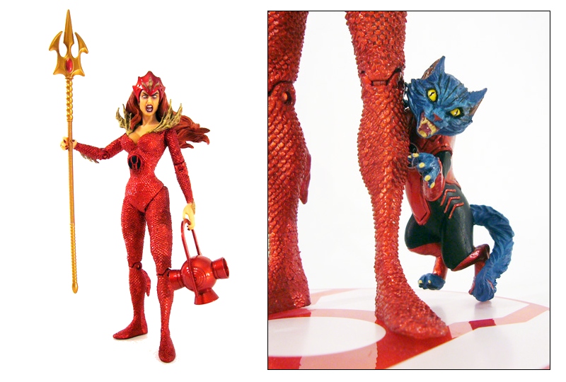 Mera, on the other hand, comes with a cool trident and another member of her corps! That’s right, it’s Dex-Starr, the Earth kitty who becomes a Red Lantern. One of the fans’ favorite characters, Dex is a fantastic addition to an already awesome figure. The cat is one solid piece and sculpted as he appeared in a famous comic book panel while floating in space, so he doesn’t exactly stand up on his own. But, the pose works perfectly with him holding onto either Mera or Atrocitus’ leg.