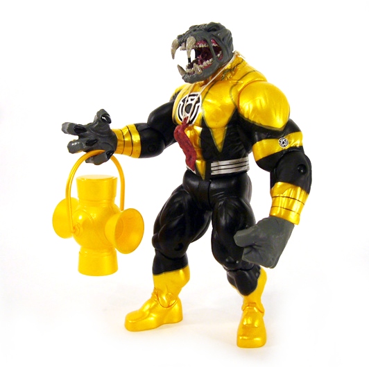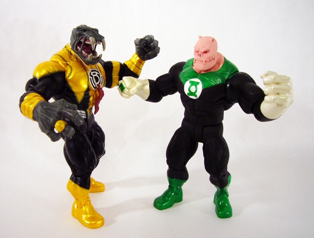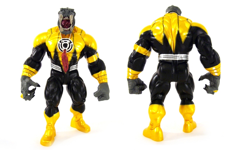 Both figures have excellent paint jobs that do plenty of justice to their sculpts. Again, Arkillo is the more subdued of the two with a standard Sinestro Corps uniform primarily in black and gold. The latter is very metallic and shiny, though, which looks awesome, and there’s a nice greenish color on the “seams” to bring out the different sections. Arkillo also has the requisite chest and left arm logo as well as the silver belt-like design. His hands and head are a deep gray that looks almost like wet clay, accented by black (claws and eyes) and gold (ring).