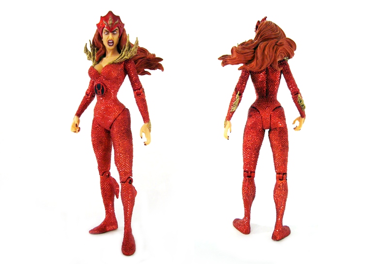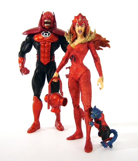 Where Arkillo is large and beefy, Mera is thin and shapely. When she became a Red Lantern her usual green coral bodysuit changed only slightly with regards to its components, and so this Mera is nearly covered from neck to toe in intricate overlapping scales. The 6 ¾ inch queen of the sea accessorizes the suit with a torso-mounted Red Lantern Corps logo, built-in lower leg fins, and a bunch of bony protrusions at the wrists, forearms, and spiky collar. Mera’s face is frozen in a silent scream of rage with a wide-open mouth and heavily arched eyebrows. Above that is her aquatic tiara/crown with its own set of small details as well as her long flowing hair.