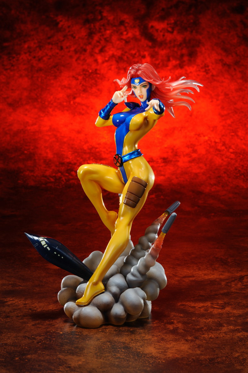Jean Grey (pictured above) will receive Koto's Bishoujo ("pretty girl") treatment based on an original character reinterpretation of her X-Men Vol. 2 #1 look by illustrator Shunya Yamashita. She tands nearly 8 ½ inches tall (in the current Marvel Bishoujo 1/7th scale) atop an exclusive georama base – a massive smoke cloud from which bursts the X-Jet and a trio of missiles. Arriving this July priced at a SRP of $59.99.