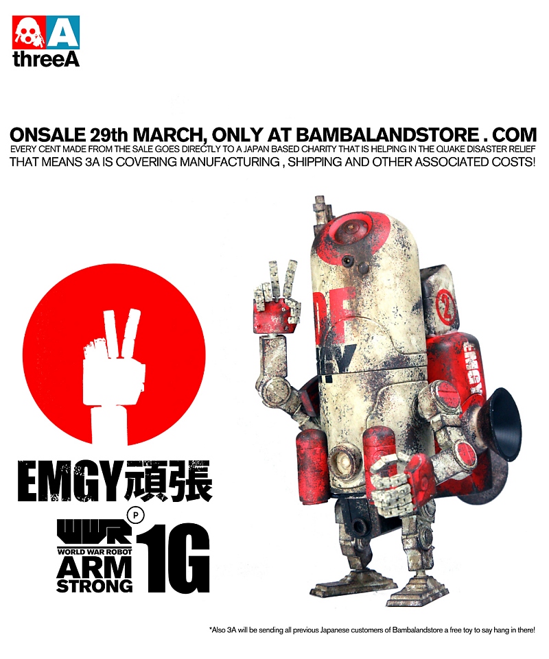 ThreeA Toys will be offering a World War Robot Portable (WWRp) action figure variant tomorrow, March 29th. Decked out in an exclusive white and red color scheme, the WWRp Japan Defence Force Armstrong is being sold in support of Japan with ALL proceeds going to charity. Retail will be around $40-$45 exclusively at bambalandstore.com.