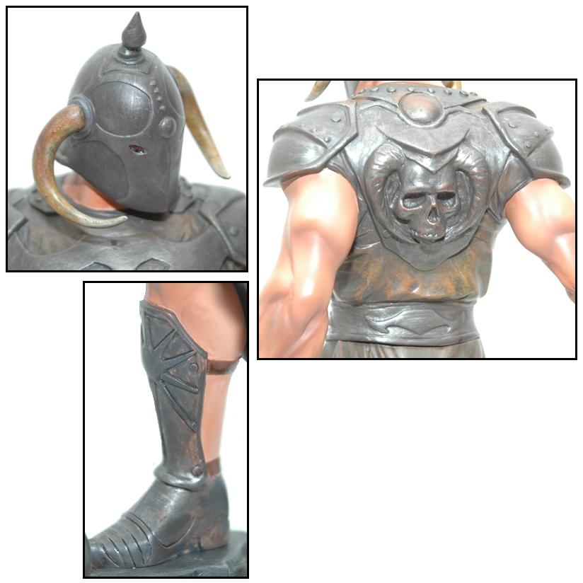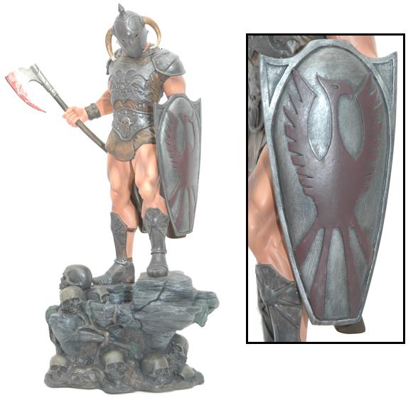 The warrior’s spiked helm - which features curving horns surrounding the plain faceplate - and ornate silver armor include detailed sculpting and layering as does the warrior's skull belt and back piece. Likewise, the iron greaves match the warrior’s shield, the motif of the falcon’s lined wings and tail present on both.
