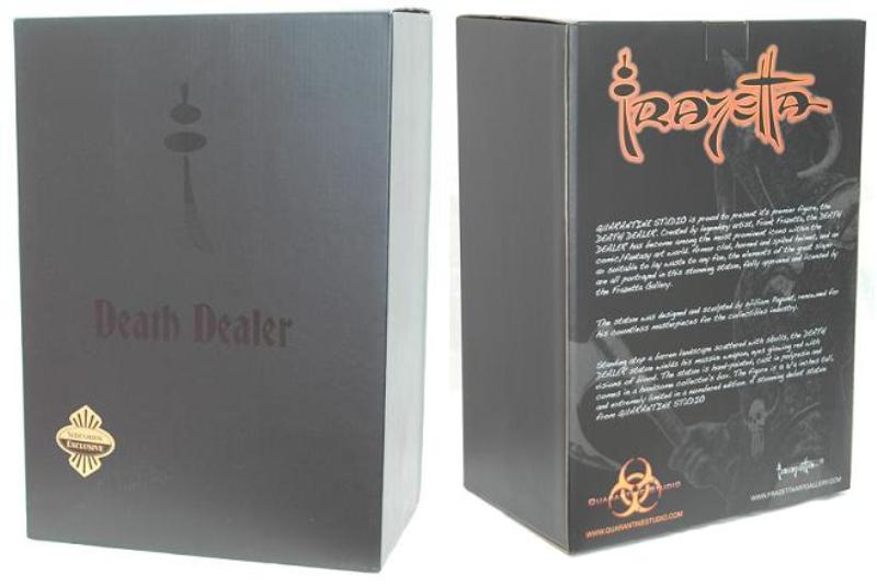 Packaged insides of a solidly constructed box with jet-black sides and front, the statue’s packaging boldly stands out on the shelf. The simple “F” signature of Frazetta and “Death Dealer” printed in glossy black on the front while the back of the box features information about the statue. The statue is held securely inside thanks to molded Styrofoam, ensuring the parts and pieces remain intact. Forget the flashy text and photos of other packages, this package – thanks to a bare minimal appearance and solid, single color – stands out as different, dark and holding something dangerous inside.