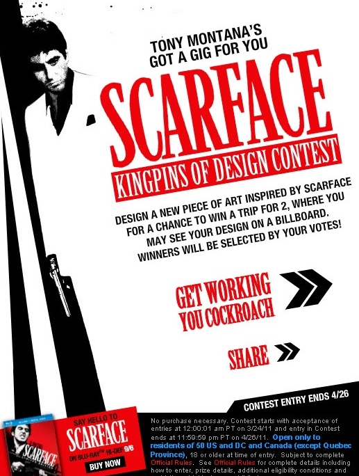 For more information on how to submit your Scarface-themed artwork, please visit the official Scarface page on facebook at www.facebook.com/ScarfaceTheMovie.