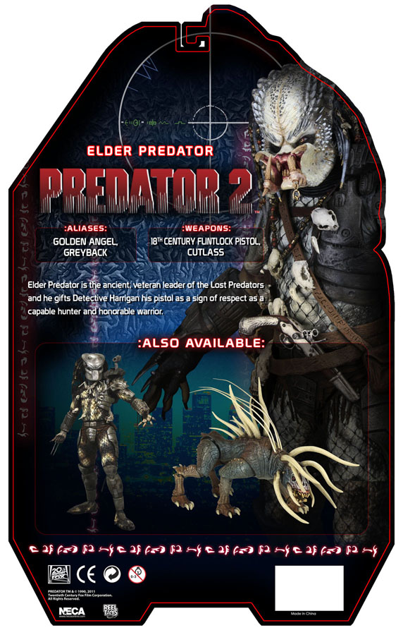 NECA provides a look at the Predators Series 3 Elder blister card, the new look for all Predator 2 based figure packaging. This assortment, due out this June, includes Elder Predator, Classic Predator (with mask) and Predator Hound.