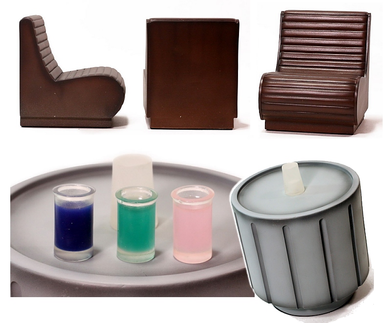 The two chairs are identical and can seat one 12” figure each. The table has a nice LED light-up feature that really adds to the atmosphere (three batteries are included). Also included are three beverage accessories, one blue, one green, and one pink.