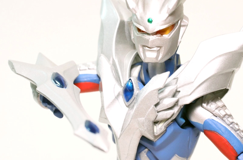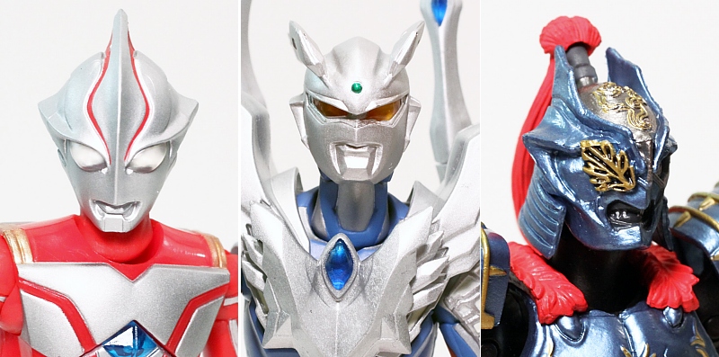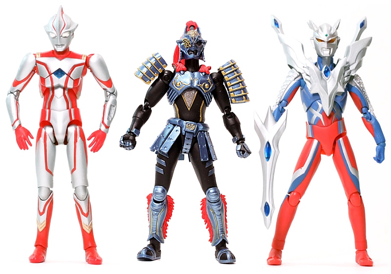 The more basic of the three is Ultraman Mebius, an update of the Ultraman TV series that made its debut in 2006. The samurai looking baddy is indeed Zamsher, foe of Ultraman Mebius. The odd man out this time around is Ultimate Zero from the 2010 film Ultraman Zero: The Revenge of Belial, but all in the Ultraman universe just the same.